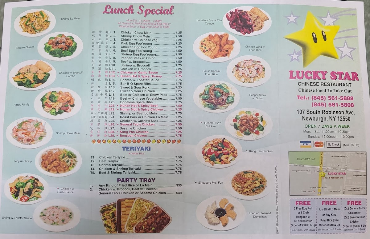 Great food, never got sick ever. Staff takes orders&very quick no longer wait U then maybe 15mins max from showing up&orderin. U can call ahead to order. CASH ONLY! NO APP PAYS! Prices r good for the portion sizes! I got a pint of house lo mein, pint wonton soup&2 shrimp egg rollS for $13! Can't beat that! Staff works w U&will let U make substitutions&U can eat inside! Parking limited but still good&easy. It is wheel chair accessible. There is no restroom though for public. It's the best Chinese in Newburgh! Plz though bring back pints of hot&sour! Not fair I cant buy a pint but must spent $6 for a quart!only sell now quarts of hot&sour soup ehen used to sell pints ugh..Many choices on the menu if U want no salt/vegetarian too! They have lunch specials for cheaper also. They r always willing to customize an order&make nice deals. Wouldn't go anywhere else in Newburgh! Only other Chinese I'd say that is head to head with quality n overall goodness is in Goshen NY for the great prices n safe food quality. They need to get rid of beggers though startin to come right in2 the business askin for money then my food I just ordered at LuckyStar! I could tell they were not hard up n wanted money for bad things. Told owner bc got scared&they don't even care/won't call police! Said well its Newburgh! I get that but I should b able to wait in peace for my food n or ride and not be harrassed for my food I just got for my sick dad/$ when there are plenty of pantries in Newburgh who do go work n serve food everyday. I know how it feels to be homeless but this person was straight out for drugs. That's bad for business I told them! My ratings have lowered bc of this! I don't feel safe as I used to sadly n the restaurant says what can we do it's Newburgh, yes but if U care about ur business you will call police that r begging harassing customers outside in the parking lot for money and inside the restaurant! Made me feel very uncomfortable! This was though the 1st time ever happened in the 5yrs I've been going there. So can let slide but I felt in danger as a woman. The staff is behind glass partitions which protect them so they don't care! I said something but the staff didnt care! All this food&soup 4 under $14! House lo mein, wonton soup, extra crunchy noodles, 2 shrimp egg rolls, nicely packed, sauces given& asked for generously, napkins, and let me customize my order for free! Lunch specials are from 11am until 3 or 3:30pm.